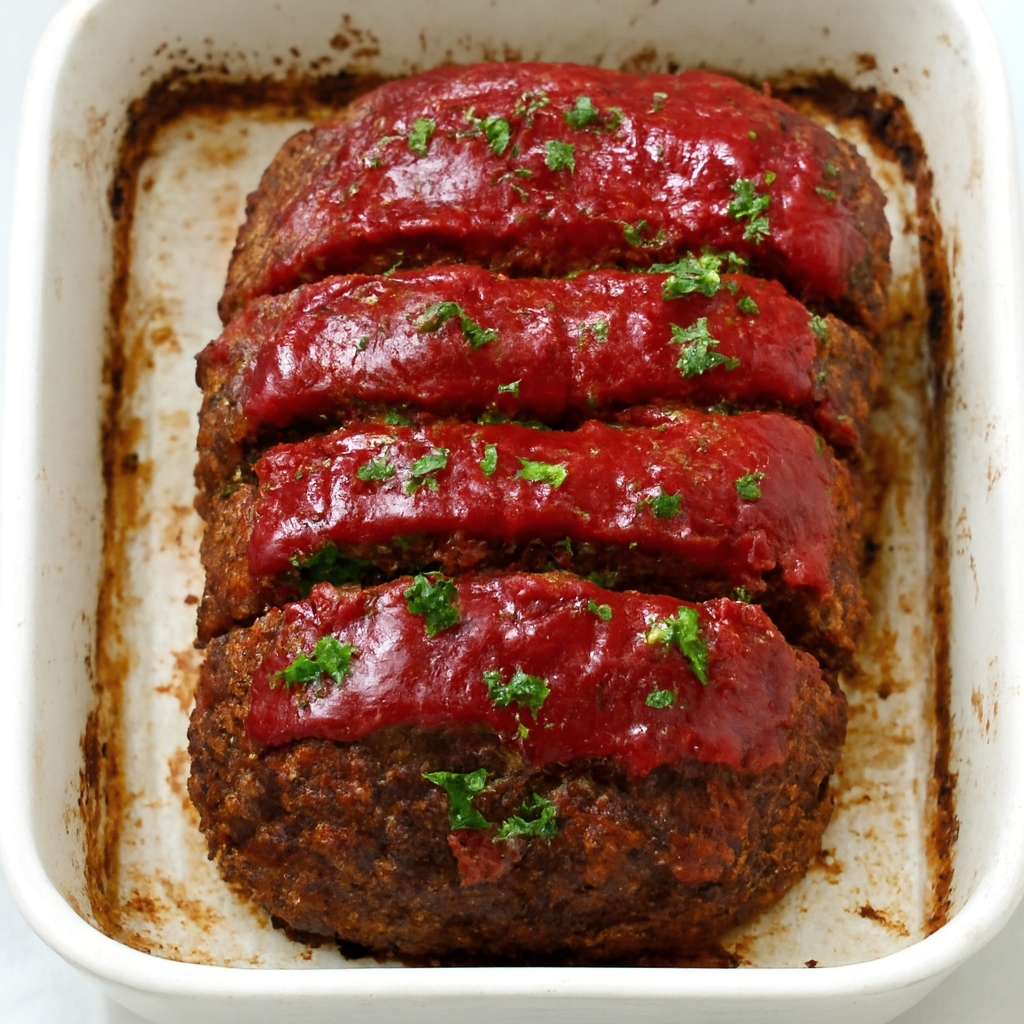 Ground beef is shaped into a loaf, baked until firm, and often topped with a light glaze that turns slightly caramelized in the oven.