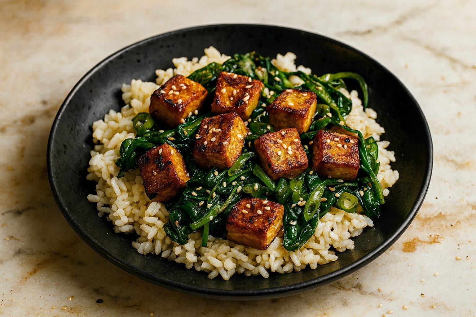 You just pan-fry tofu until it’s golden, then mix it with veggies like bell peppers, broccoli, or carrots. After that, pour a soy-garlic sauce and let it cook for a minute.