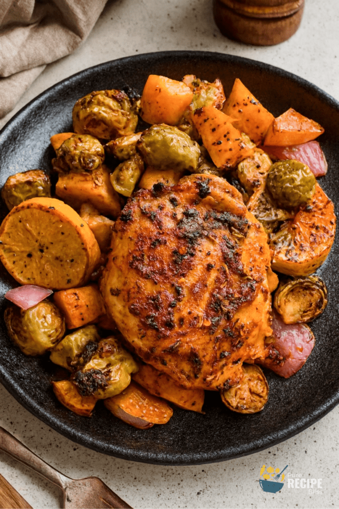 The sheet pan chicken and veggies recipe is a one-pan dinner where chicken thighs roast directly on top of seasoned vegetables. It’s practical, flavorful, and makes cleanup simple. The roasted Brussels sprouts, squash, and lemon slices bring balance, while the chicken stays juicy.